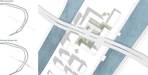 Ce projet se situe sur L’Île-Saint-Denis, au cœur d’un quartier en pleine transformation. C’est un site complexe offrant un paysage varié, caractérisé par son insularité et fortement marqué par le passage en viaduc de l’A86. C’est cette question que nous avons choisi d’aborder ; celle de l’infrastructure et de sa relation au territoire.
