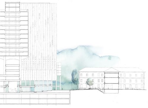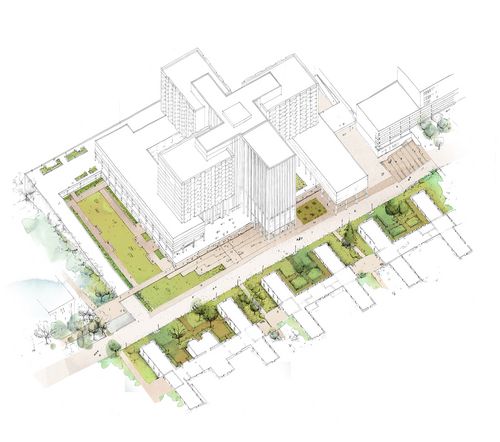 Le mail qui permet de parcourir la ceinture de Paris depuis la Porte de Clichy jusqu’à la Porte des Poissonniers est interrompu au niveau de l'hôpital par une dalle imposante qui constitue le socle de la Tour. Ainsi, l'intention principale de ce projet est de découper une partie de la dalle pour restituer cette traversée. Mais comment qualifier et redéfinir l'espace obtenu après cette intervention importante? La réponse proposée par ce projet est d’entremêler et de tisser le mail à différentes séquences et à différents espaces urbains en relation avec les édifices du site.