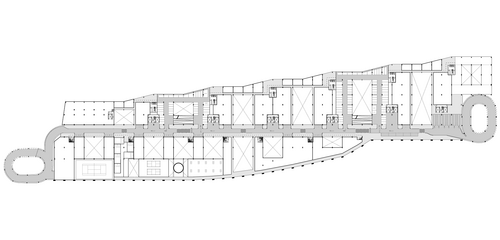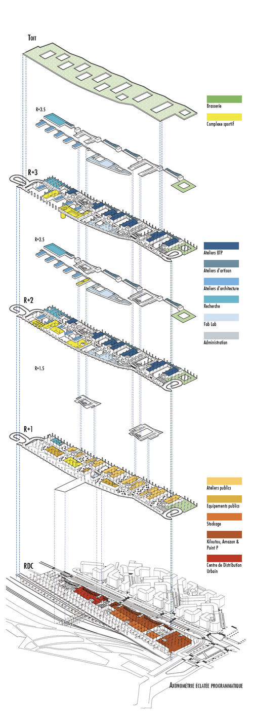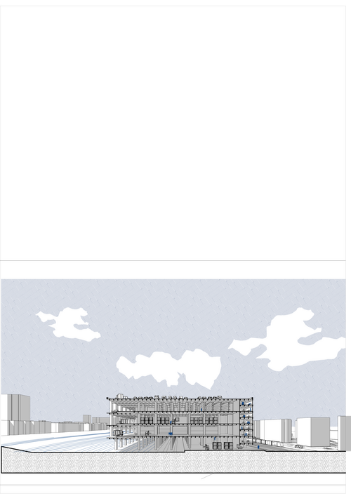 Des programmes variés s’installent dans les aires de contact avec les espaces publics et permettent ainsi une meilleure insertion urbaine du bâtiment. Les rues intérieures superposées traversent le bâtiment de part en part. Des patios, distribués en quinconce permettent d’apporter de la lumière naturelle pour la voie et d’habiter le bâtiment. Une grande variété d’espaces de travail et la friction entre différents programmes permettent d’envisager une ambiance éminemment urbaine au sein du bâtiment.