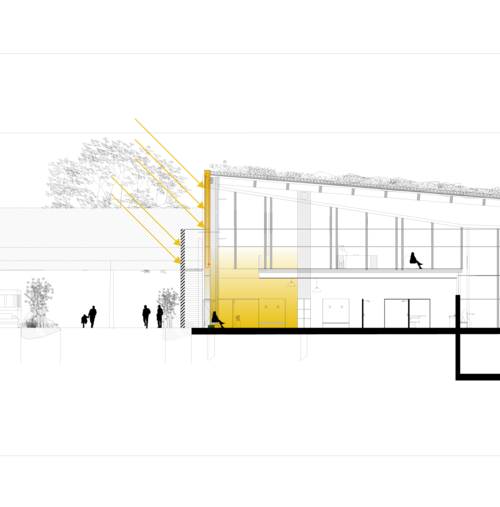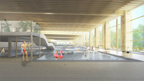 Le projet se situe à Noisy-le-Sec, à la frontière entre Bondy et Bobigny. Il s’inscrit dans une dynamique de renouvellement urbaine propre au Grand Paris, initiée le long du canal de l’Ourcq. Le renouvellement des transports en commun le long de l’axe RN3 – Canal accompagne la transformation de la Seine-Saint-Denis. Le site se trouve au niveau d’un carrefour urbain, qui va être totalement transformé par l’arrivée d’une nouvelle gare du Grand Paris. Cette gare fera le lien entre métro 15, tramway, tzen et bus. A proximité, le long de la ZAC, des logements avec vue sur le canal sont planifiés. Le projet vient proposer une mixité programmatique afin de faire vivre le projet de ZAC attenant, en y implantant un équipement sportif qui profite au plus grand nombre. L’espace piscine se développe parallèlement au canal, en analogie. Un bassin à filtration naturelle, utilisable durant les périodes estivales, créé de l’animation et permet d’expérimenter un nouveau type de baignade. Depuis le chemin de halage, une interaction est créée entre les promeneurs et les baigneurs. La partie Est répond à la gare et contient un café, et des salles de sport et balnéothérapie. L’ensemble a été traité en bois afin de réduire l’impact du complexe sur l’environnement. La structure moisée du centre aquatique rappelle le passé industriel du lieu tout en s’adaptant aux techniques actuelles.