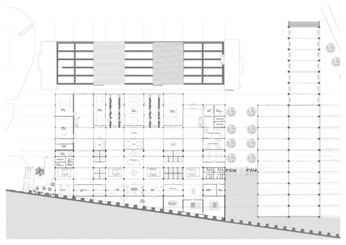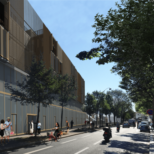 Les enjeux urbains ont été traduits à l’échelle architecturale. L’ambition urbaine de connexion et d’intégration du site à la ville a composé tant le fondement du plan d’aménagement que le développement architectural. Aujourd’hui dépourvue d’urbanité et aménagée 6 mètres au-dessus du niveau du site, la rue Ordener a orienté les choix volumétriques. L’édifice hybride se compose en partie d’une ancienne halle de la SNCF associée à une extension neuve sur rue.