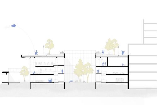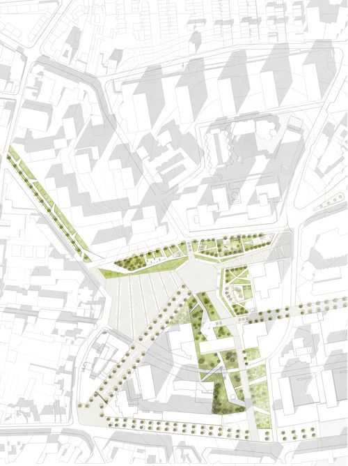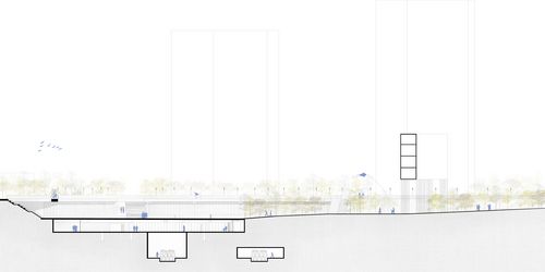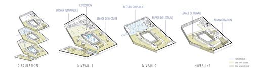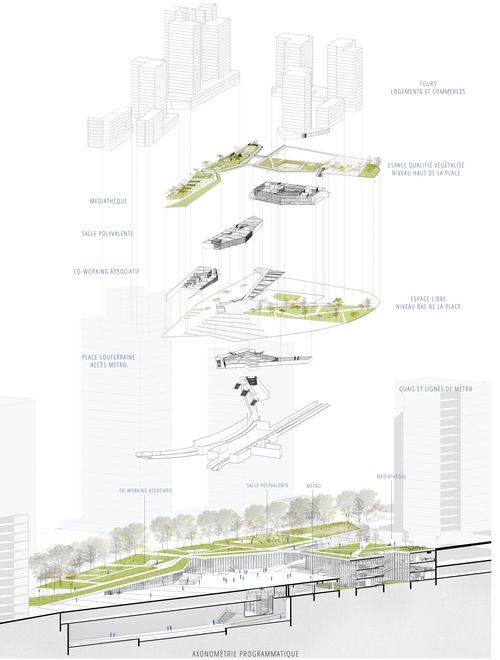 Travailler sur le site de la place des Fêtes m’a permis de me confronter aux questions fondamentales qui sont : habiter le paysage urbain très marqué et comment dynamiser et désenclaver un espace public délaissé. Dans ce projet, mon intention principale a été, de redécouvrir la place en proposant une nouvelle expérience physique et sensible de la topographie. Le travail de la topographie, des flux ainsi que des nœuds d’accroche ont tous eu pour but de « relier la place à son quartier » et permettre une meilleur fréquentation et fluidité du parcours. Ma seconde intention a été d’habiter la place et de la dynamiser à toute heure de la journée par le biais d’un programme mixte semi enterré pour une intégration en douceur dans son site. La pluralité du programme d’un pôle culturel associatif permet de relier la place au quartier ainsi qu’à la capitale, proposant de nouveaux usages, manquant au quartier. Enfin, mon développement sur l’élément culturel du programme, la médiathèque a permis le travail sur la lumière et les usages du programme.