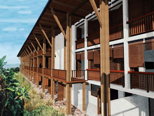 Un travail important est mené sur l'étude de l'architecture locale, sur les structures en bois, sur la ventilation naturelle grâce aux Alizés, la protection du soleil et des pluies importantes.