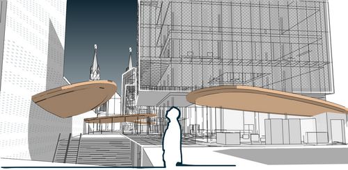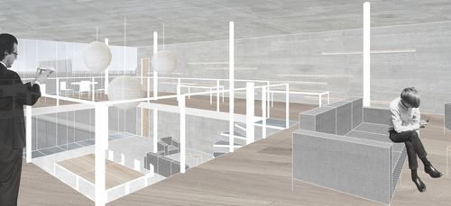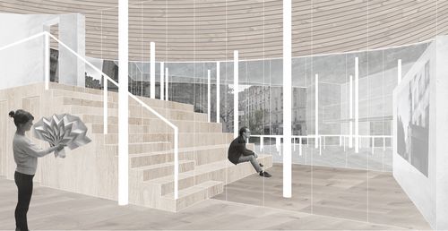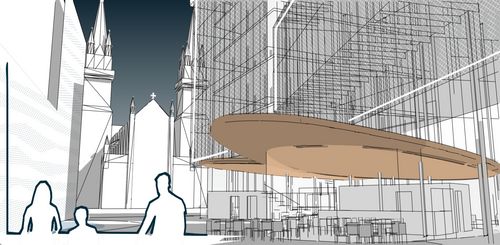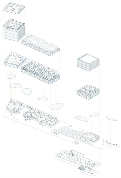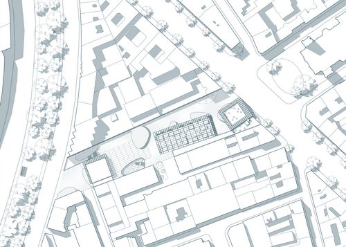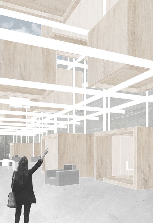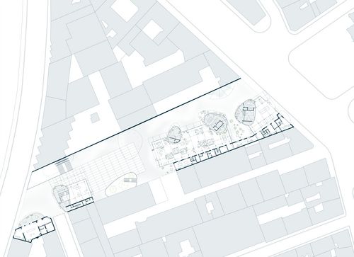 Mon projet s’inscrit dans les thématiques suivantes : la création, les tiers lieux et les clusters. Le domaine de la création reste une notion classique tandis que les tiers lieux et les clusters sont éléments moins connus. Le premier désigne des lieux hybrides, ni totalement lieu de travail, ni totalement lieu de vie qui regroupe des personnes autour d’une thématique, le second désigne un assemblage d’activités complémentaires exerçant dans le même domaine. Mon partis pris a alors été de créer un lieu dédié a la production artistique avec comme objectif majeur de favoriser les interactions entre les professionnels tout en favorisant l’action de médiation culturelle : éveiller le public aux pratiques artistiques. Ainsi 3 volumes francs accueil les espaces de productions (ateliers, studios, bureaux), en dessous se développent les espaces de médiations abrités par des formes souples en bois. L’ensemble habite un unique côté de la parcelle de manière à dégager une vue dynamique sur l’église Saint-Ambroise.
