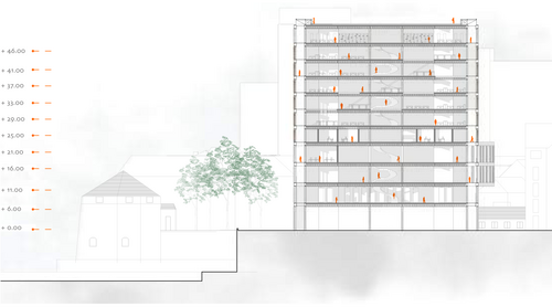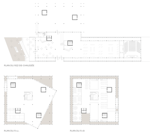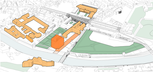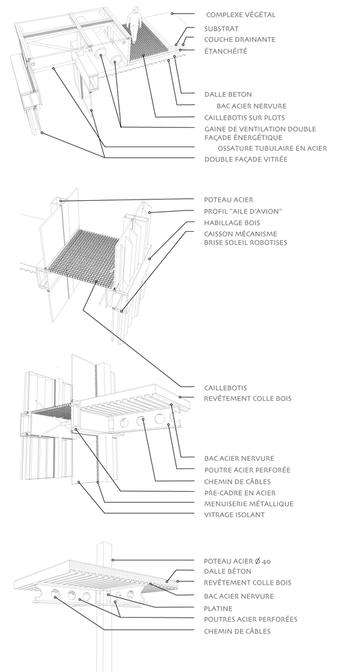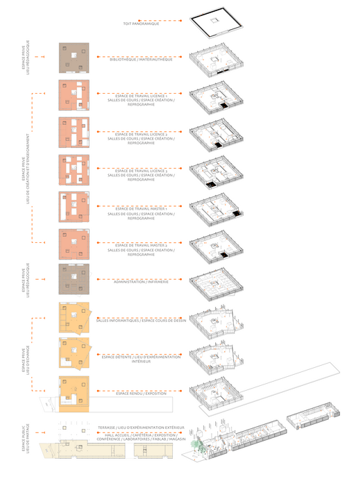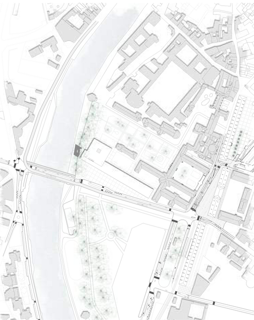J’ai choisi de réaliser mon PFE sur le site de l’ancien Hôpital St Jacques de la ville de Besançon. Le site choisi est inondable, encerclé par la ceinture verte de la ville ainsi que par des bâtiments historiques. La stratégie urbaine adoptée a pour but de connecter une nouvelle ENSA à son environnement. Le programme et la taille de cette ENSA provient d’une analyse de différentes ENSA. Mon ENSA reprendra quelques points importants de cette analyse : un plan libre, des espaces modulables, des espaces extérieurs végétalisés, beaucoup de lumière naturelle, de grand hall d’entrée servant d’exposition, des terrasses et des espaces d’échanges. Cette école est donc composée de deux bâtiments, un long en RDC qui est une continuité de la trame bâtie existante. Il sera public et abritera des programmes ouverts sur la ville (exposition, cafeteria, amphithéâtre…). Il sera en porte à faux au-dessus des berges. L’autre bâtiment, comme posé sur ce premier, sera un cube, offrant ainsi quatre vues précises et une vue à 360° sur le toit. Ce cube est réparti en deux partie distincte en façade : la partie travail, occultée par des brises soleil, et la partie commune très ouverte sur l’extérieur. Pour les espaces de travail, ils sont répartis par années, ces différentes années sont en constante communication grâce à des étages en quinconce qui permettent de visualiser un espace de travail depuis un autre. La structure du bâtiment est un système poteau poutre en acier, avec des poutres perforées, permettant le passage des gaines. Elles seront apparentes, le but de cette école étant aussi de montrer entièrement la construction. Pour éviter les problèmes de protection thermique, une protection composée d’une façade vitrée ainsi que de panneaux rotatifs robotisés en forme d’aile d’avion composés en bois est mise en place.