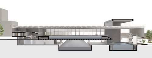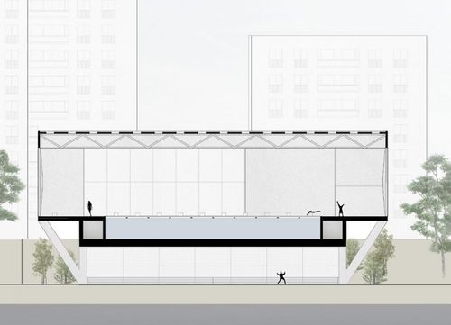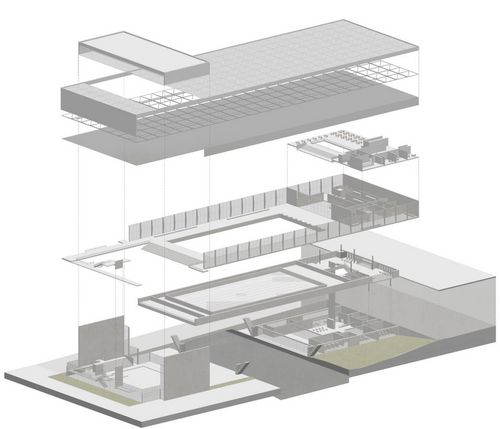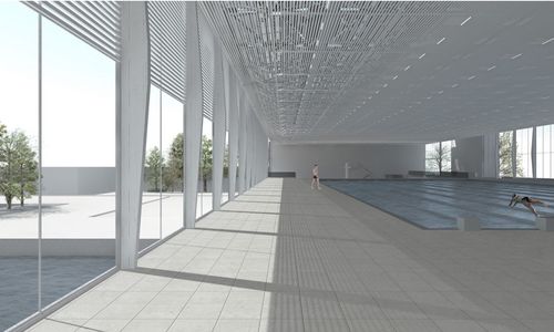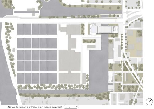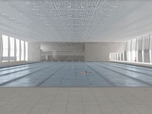 Le bâtiment se défini dans le paysage comme une horizontale mais il révèle son principe fonctionnel par son franchissement du canal. La liaison créée entre la Marne et le canal Saint-Maur se fait sous le bâtiment. Ainsi, il doit répondre aux contraintes structurelles d’un pont. Sous le bâtiment, le canal mesure 30 mètres de largueur. Le bassin de natation principal est situé dans la zone de franchissement afin de profiter des murs de refends comme élément structurel. Des poutres voiles permettront alors de franchir le canal. La structure est un élément de conception majeur dans ce projet. Ce point de départ me permet d’aboutir à un bâtiment lisible et qui démontre son principe fonctionnel. Différentes maquettes de travail sont présentées sur la page suivante. Elles mettent en avant l’affirmation tardive du principe fonctionnel et les propositions de géométries.