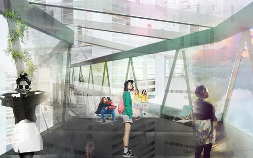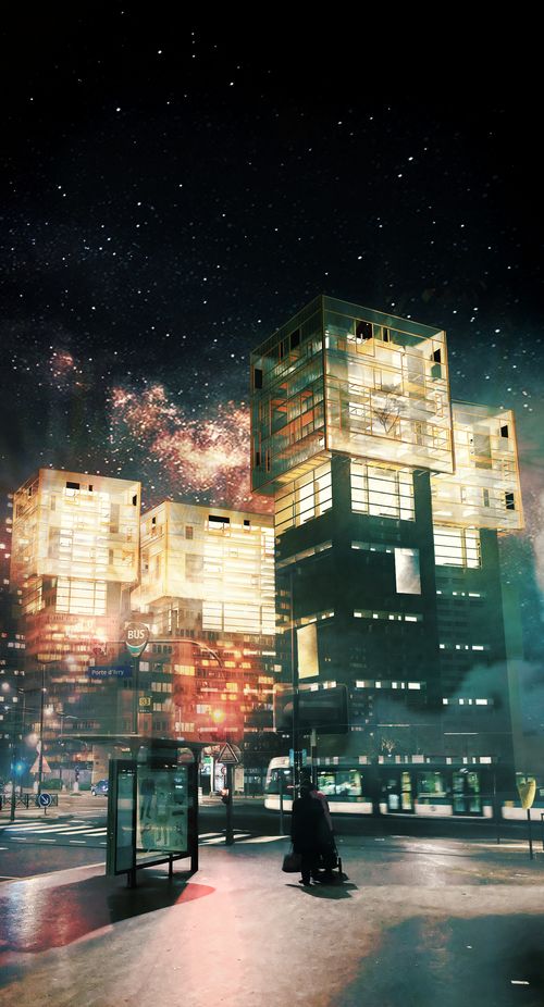 Après avoir rédigé un mémoire sur « habiter les toits des villes » mon intention fut de trouver un site sur lequel je pourrais expérimenter ce type d'habitat. Sensible également aux nouveaux enjeux des villes (mutation urbaine, revégétalisation des villes...) ,exposés par l'AIGP (Atelier International du grand Paris), je souhaitais trouver un site sur lequel je pourrais revaloriser une architecture en crise et son contexte. Mon choix du site s'est donc porté sur un îlot d'IGH de logements sociaux conçus dans les années 70 par l'architecte Jean Sebag. Situé entre le boulevard Massena, l'avenue d'Ivry, l'avenue de Choisy et à proximité d'un tronçon de la petite ceinture,actuellement recouvert par une dalle en béton. Le site existant présente une véritable pauvreté urbaine au niveau du sol.Mon intention première fut donc d'aménager le sol en un écoquartier, avec notamment la réhabilitation de la petite ceinture en nouvelle voie verte, la réhabilitation d'un centre commercial central, en plate forme d'agriculture local. La deuxième intention consiste à transformer l'architecture en béton, standardisée, et monotone des tours de logements, en tours multifonctionnelles avec la création de terrasses collectives et privées, de duplex, d'un espace central vitrée sur 3 niveaux, En haut de la tour des balcons en bois viennent se greffent à la structure actuelle, et une peau en polycarbonate percée par des grandes ouvertures vient recouvrir l'ensemble. Le toit de la tour prend la forme d'un lampion est créé ainsi un signal poétique fort dans la ville à la fois de jour comme de nuit. Enfin la dernière intention fut de créer des passerelles en verre et en acier pour relier ces tours et recréer des liens entre les habitants de ces tours.