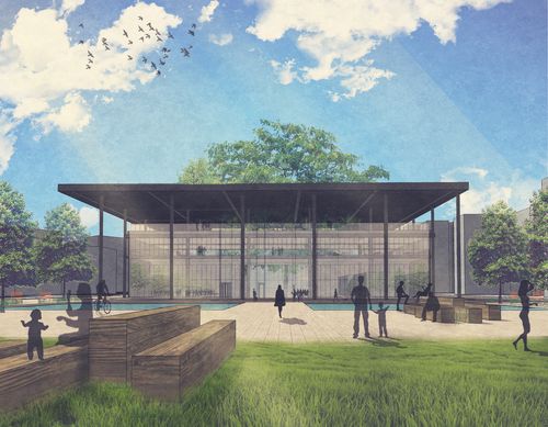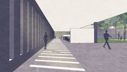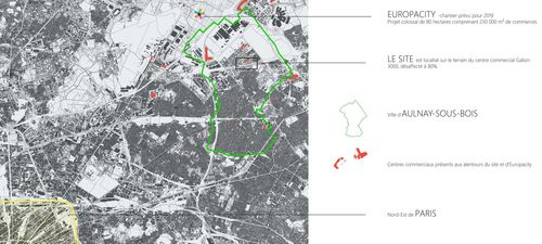 L'idée de faire ce projet est née lorsque je me suis interessé à Europacity, projet massif de 80 hectares comprenant 230 000m² de commerces, qui sera situé sur le triangle de Gonesse. On assiste déjà à une saturation forte des centres commerciaux aux alentours de ce lieu. Mon site est ainsi localisé sur le terrain du centre commercial Galion 3000, désaffecté à 80%, situé dans la partie Nord d'Aulnay sous Bois, quartier difficile rencontrant des difficultés économiques, sociales et urbaines majeures. Dès que Europacity ouvrira ses portes, il est très probable que Galion fermera définitivement. Le projet est de détruire Galion 3000 pour créer une tentative de redynamisation du Nord de la ville par une mixité d'espace, d'activités est dont le centre est une médiathèque. L'objectif est de tisser du lien social par le biais de quatre bâtis et espaces urbains disposés en croix, centralisant un lieu de brassage et de sociabilité : la médiathèque. Dans le programme est présent un auvent pour le marché en plein air, un skate-park, deux tours d'habitation gardées, une salle de sport, un parc, des espaces publics.