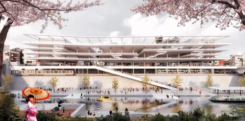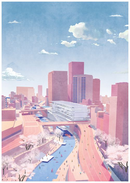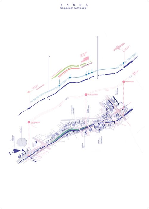Tokyo est une Shrinking City, une ville en rétraction. Ses banlieues se vident, alors que ses centres continuent à se densifier. Dans ce contexte, nous voulons réinvestir les canaux historiques dans le but de créer des espaces naturels, dédiés à calme, au bien-être et au loisir. Nous pensons en effet que dans les milieux fortement urbanisés comme Tokyo, il y a un réel besoin d’espaces naturels, nécessaires tant pour des questions écologiques que pour assurer le bien-être des habitants. Nous avons donc étudié le canal Kandagawa, situé au coeur de la capitale, et qui a la particularité d’être longée par la ligne ferroviaire Yamanote. L’aménagement des berges se focalise de part et d’autre de la station de train Ochanomizu. Un programme sportif se développe le long du cours d’eau à travers des plateaux qui se posent sur les quais. Des piscines naturelles, des clubs de canoë-kayak et des pistes de courses sont disposés dans l’ambiance à la fois très végétale et très urbaine du canal. La station Ochanomizu, en plus d’accueillir l’arrêt de train existant, connecte le nouveau réseau fluvial et le