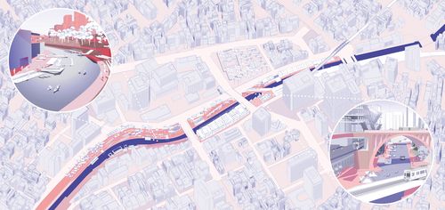 Tokyo, la plus grande mégalopole du monde, a été fondée sur des canaux. Véritables artères structurantes de la ville à l’époque d’Edo (16ème siècle), lieux d’échanges, de rencontres et de transport, ces canaux sont depuis tombés dans l’oubli. La mise en place du réseau ferré au 18ème siècle, ansi que celui des autoroutes urbaines à l’occasion des Jeux Olympiques de 1964 se sont littéralement développés sur le tracé ancien des canaux. Aujourd’hui, ces cours d’eau, ou du moins ce qu’il en reste, est complètement délaissé au profit des autres réseaux modernes. Pourtant, ces lieux cachés derrière les infrastructures de mobilité constituent un potentiel remarquable en vue des enjeux actuels de la ville. En effet, en conséquence du déclin démographique du pays,