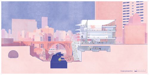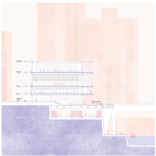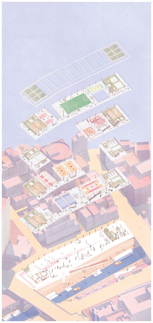 niveau de la rue par le biais d’un équipement intermodal et mixte. Des plateaux sportifs ouverts et en balcon sur le canal sont disposés en émergence sur la gare, pour y accueillir des sports de terrain.