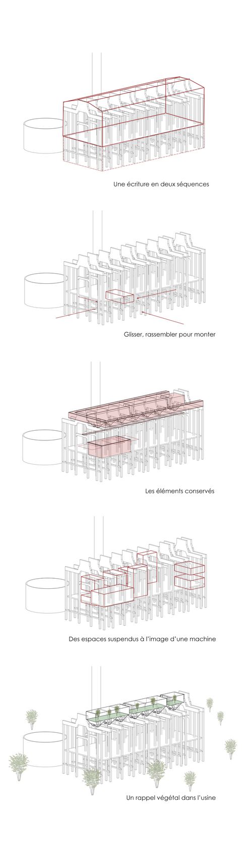 Notre projet consiste en une reconversion d’un bâtiment industriel, une ancienne chaufferie, la CPCU à Ivry-sur-Seine dans le périmètre de la ZAC Ivry Confluences. Dans ce projet notre site laisse place au Parc de la Confluence et la chaufferie est prévue démolie. Suite à l’analyse du projet d’Ivry à l’échelle métropolitaine et de ses évolutions nous avons choisi un des scénarios proposés, puis nous avons développé un projet de recomposition urbaine s’appuyant sur ce bâtiment, qu’on choisi de conservé au sein de ce parc, aménagé en équipement référent pour ce quartier en devenir. Nous cherchons donc à intégrer cet édifice tout d’abord dans un parcours intercommunal, puis à l’échelle de la ville d’Ivry et enfin dans le futur parc de la Confluence (notamment en libérant le sol pour l’offrir à l’espace public), tout en gardant une certaine mémoire du lieu faisant de cet ouvrage un bâtiment témoin du passé industriel d’Ivry-sur-Seine