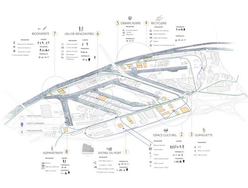 Le Port de Gennevilliers, première plateforme multimodale fluviale de France, est un territoire public mais enclavé. Amené́ à évoluer dans les années à venir, et notamment avec la construction d’un nouveau port séquanien à Achères, le Port tourne aujourd'hui le dos à la ville et semble ignorer le fleuve. Il recèle pourtant de paysages naturels et industriels surprenants, bien qu'il reste difficilement accessible au public. Ainsi, comment promouvoir l'image du Port et la connaissance de son rôle à l'échelle du Grand Paris et de la Seine? Ce projet propose de reconnecter le Port avec sa ville et les berges de Seine, tout en le rendant accessible et praticable à l’échelle humaine, en recréant une unité, une cohérence d'ensemble. Il s’inscrit dans le temps, et propose d’intervenir ponctuellement sur ce lieu de transit, tout en respectant les entreprises qui y sont implantées. Les réseaux de flux ferroviaires et fluviaux sont rendus accessibles au public, et une promenade piétonne viendra relier les différentes interventions entre elle, et avec le grand territoire.