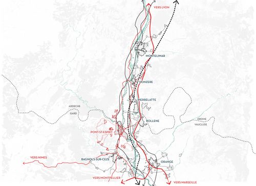 Nous proposons un phasage à long terme dans lequel la priorité d'intervention serait le réaménagement urbain du boulevard et des entrées du bourg. Offrir de nouveaux scénarios d'usages au boulevard tout en repensant la circulation et la gestion du stationnement pour mieux révéler le tissu historique du centre-bourg. Par la suite, intervenir sur le bâti ancien au travers d'interventions architecturales et oprétions du curetages. La boîte à outils projectuels propose ds solutions qui s'appliquent au cas par cas en fonction des îlots et des parcelles afin d'améliorer les qualités de l'habitat en centre ancien. Enfin, après l'opération urbaine et architecturale sur l'ensemble de Pont-Saint-Esprit, intervenir sur des projets de plus grosse ampleur à rayonnement territorial au travers de la réhabilitation de l'hôtel Dieu en centre de formation d'apprentis pour les métiers de la pierre.