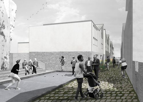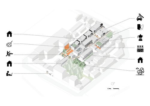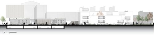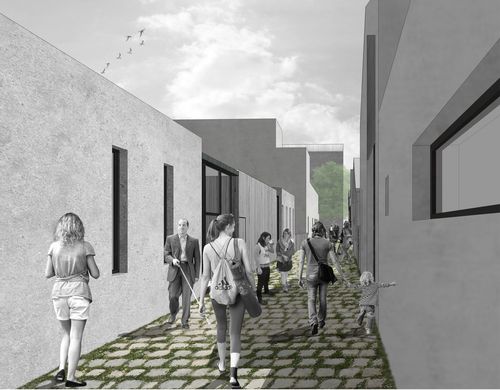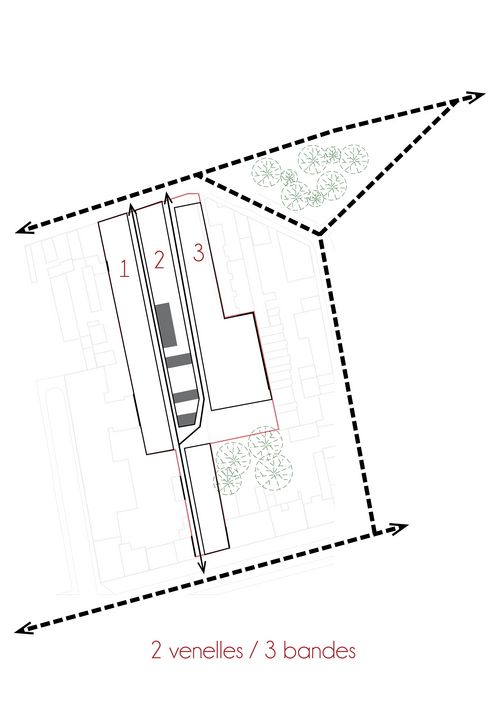 A travers ce projet nous avons voulu aller au-delà des règles d’accessibilité concernant le handicap. Notre travail nous a permis de réfléchir sur la manière d’inclure des personnes en semi-autonomie désirant continuer à vivre leur vie, seules. C’est à travers différentes visites de foyers et d’analyses de structures existantes que nous avons réfléchi sur la manière dont l’architecture pourrait répondre à la demande de ces personnes à tisser des relations de proximité dans le but de vivre comme tout le monde. Nous avons élaboré un programme dans un caractère faubourien en cœur d’îlot dans la ZAC de la fraternité à Montreuil. Il se compose de logements (ordinaire, ULS et unité de vie), d’un centre d’accueil de jour, d’espaces partagés (salon, salle polyvalente, buanderie, cours privées, espace informatique et un café solidaire), deux espaces commerciaux en bout de parcelle et des espaces extérieurs (jardin, mur d’escalade, terrain de pétanque et potager). Ces espaces sont organisés en trois bandes séparées par deux venelles, l’une publique et l’autre privée sous servitude.