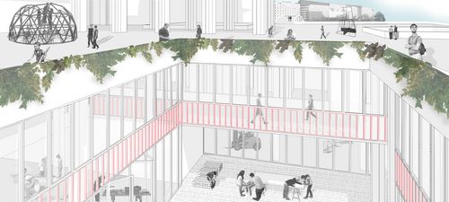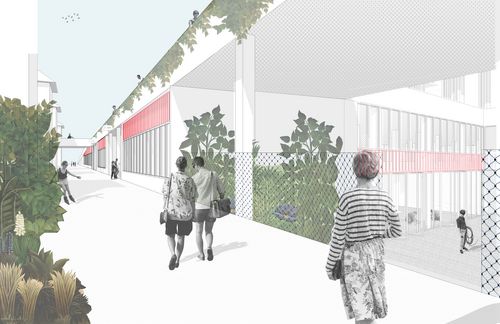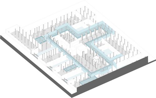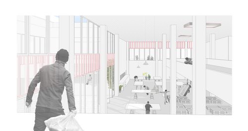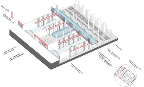 Le déménagement de l’hôpital Bichat en 2025 pose la question du devenir de ce site et de son ouverture sur la ville. En effet, une fois évidé de ses fonctions, les bâtiments pourraient accueillir de nouveaux usages et participer au renouvellement de la ville. La déconstruction de certains bâtiments pourrait constituer une ressource importante en gros œuvre et second œuvre. Ce nouveau territoire devenu gisement serait l’occasion de développer une nouvelle activité sur ce site, plus en lien avec l’histoire de Saint Ouen. La proximité du site à la limite que constitue le périphérique pourrait en faire un point clé d’articulation entre Paris et Saint-Ouen. Le projet proposé est celui d’un pôle réemploi qui viendrait s’installer lors de la déconstruction du site et qui accompagnerait son chantier. Le pôle rémploi se nourrit des matériaux déconstruits sur le site, jusqu’à développer progressivement sa propre autonomie. Il est composé d’un centre de recherche qui comporte des laboratoires d’analyse des matériaux, des agences et collectifs d’architectes spécialistes de ces questions, des espaces d’exposition, un showroom et des amphithéâtres dédiés au public ainsi que des ateliers spécialisés au traitement des objets d’architecture.