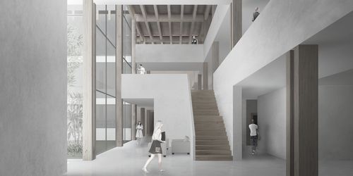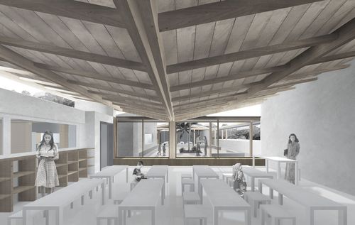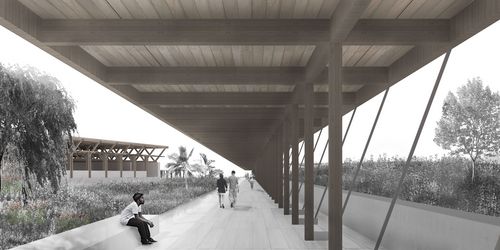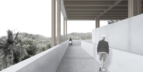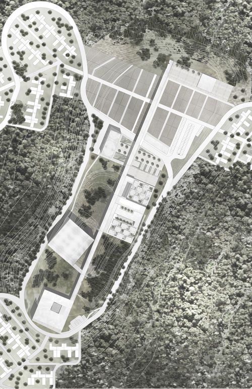 Nous avons travaillé sur le thème de l'extension de la ville de Saint-Laurent-du-Maroni. Un thème qui nous paraissait intéressant car une des principales caractéristiques de cette ville est sa très forte croissance démographique (40% par an). Nous avons mis en place un système d'extension qui respecte et intègre mes différentes entités paysagères de cette ville, à savoir le relief, les zones inondables et la forêt amazonienne. Nous avons nommé ce système la ville inversée car nous installons tous les équipements publics au sommet des collines pour créer de nouveaux coeurs de village. Ainsi, les habitations se trouvent sur la penteet sont regroupées le long de corridors denses qui relient les sommets. Et au niveau le plus bas se trouvent les zones inondables sur lesquelles sont installées des parcelles agricoles dédiées aux habitants de ces nouveaux villages. Le traitement d'un sommet en particulier a fait l'objet de ce PFE. Nous avons dessiné le plan masse de ce sommet en intégrant plusieurs programmes comme une médiathèque, un groupe scolaire, un gymnase, une place de marché, un espace public minéral, un parc et un lieu de culte. Nous avons travaillé en détail les trois bâtiments les plus importants, à savoir la médiathèque, le groupe scolaire et e gymnase.