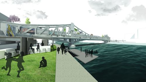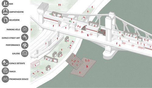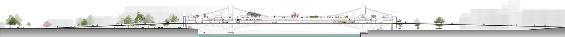 J’ai choisi le site de la Confluence, au croisement de la Seine et de la Marne. C’est là que se trouve la passerelle aux câbles. Sa fonction première est de permettre le passage de câbles électriques d’une berge à l’autre, reléguant au second plan la fonction de traversée piétonne. Les enjeux sont les suivants: permettre un franchissement plus lisible, reconquérir les berges en valorisant les circulations douces, révéler l’infrastructure existante qui est porteuse de potentiel. La passerelle devient un maillon essentiel au coeur d’un dispositif intercommunal reliant les espaces vert d’Ivry à Charenton. Elle est dilatée à la fois dans l’épaisseur et la longueur. J’y insuffle une autre forme d’énergie que celles des câbles: une énergie humaine. Le caisson centrale de la passerelle est investie par des activités dédiées aux habitants. La partie haute devient une allée paysagère surélevée s’ouvrant sur la Confluence. La passerelle devient centralité dans son territoire. Ce projet de fin d’étude permet l’amorce d’une réflexion sur les nouvelles manières de vivre la Ville de demain.