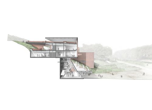 Le projet tente d’implanter un nouveau pôle à Saint-Brieuc, basé sur l’évènementiel et la culture (en terme de création et de diffusion), adaptable aux flux de population dus aux nombreux étudiants et au tourisme estival. De plus, il propose de construire la pente, permettant de la traverser verticalement et horizontalement. Le bâti devient parcours venant percer le mur végétal.