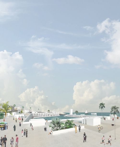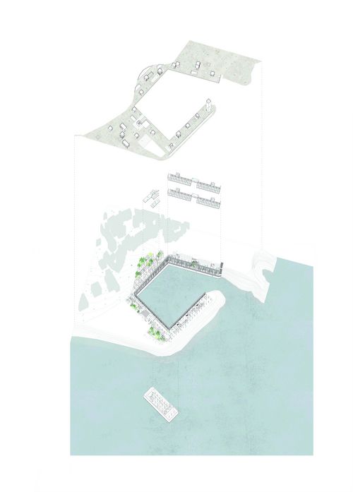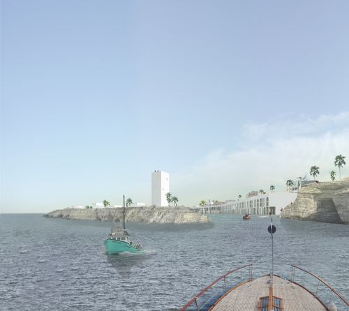 A travers ce projet, j'ai souhaité travailler sur l'ancien port de pêche de la ville de Monastir. Ce dernier est devenu un site enclavé, de part la topographie, mais également à l’abandon car devenant trop étroit (il a ainsi été délocalisé plus au sud dans la ville). J'ai ainsi voulu le revaloriser, en le redonnant à la ville et aux habitants. Malgré le délaissé urbain, il occupe une place stratégique, puisqu'il est à l'intersection entre la ville et la mer. Un centre de recherche n'est pas un bâtiment indépendant mais il induit d'autres programmes. On a donc un centre d’hébergement, un centre de recherche, un centre de formation, un aquarium et un marché. Pour l'implantation, je viens ainsi m'insérer dans le dénivelé et occuper des vides. Je viens rattraper le niveau haut et le niveau bas pour créer une promenade connectée à la ville. L'eau devient le centre du projet. Ce n'est pas seulement un élément fonctionnel mais véritablement une mise en scène. Le projet épouse ainsi la forme du port, offrant ainsi à la ville une nouvelle façade urbaine.