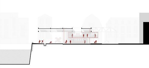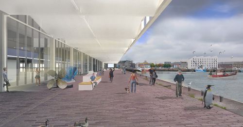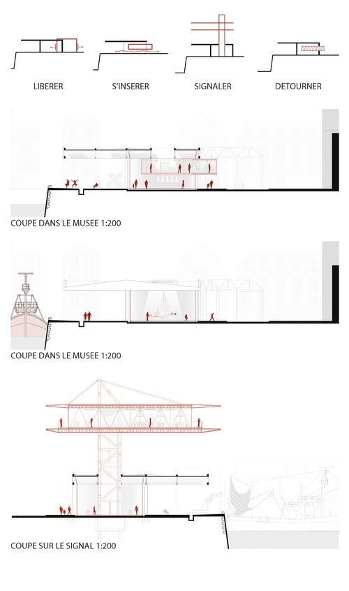 Permettre la cohabitation de plusieurs fonctions et activités : musée, criée, marché, hôtel, logements, commerces, promenade, place sur un site unique : l’île du Pollet à Dieppe. En réemployant la halle en béton précontraint existante, accueillant aujourd’hui la Criée et en signalant cette prouesse technique dans le paysage urbain, nous cherchons à rappeler la place du port dans la ville de Dieppe et à ranimer un quartier victime de la décroissance des activités portuaires.