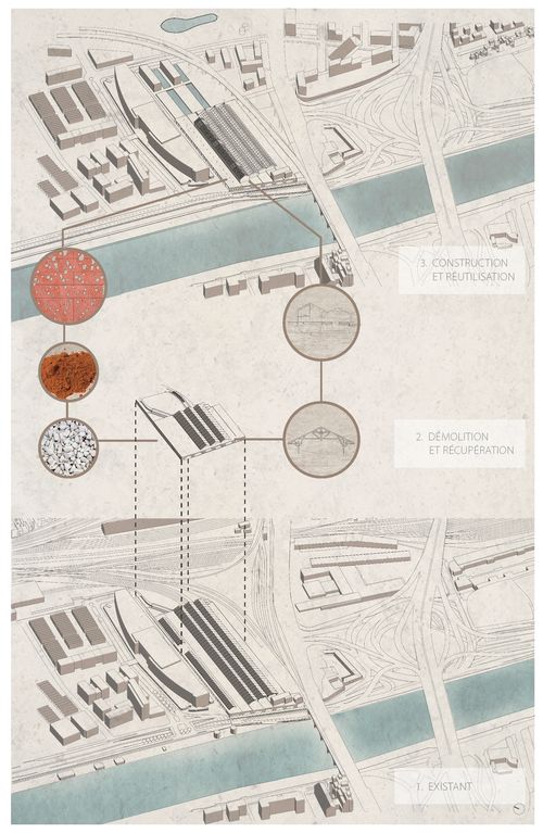 Ce projet vise à répondre à une problématique plus que jamais prégnante à Paris, et en France de manière plus globale, concernant la mise en valeur du patrimoine architectural par sa réhabilitation et sa réinsertion dans la société. Afin de traiter ce sujet qui m’intéresse depuis plusieurs années, j’ai choisi d’étudier l’ancienne Gare Frigorifique de Bercy-la Rapée, située dans le 12e arrondissement de Paris, et de réaliser le projet de sa transformation en un lieu public dédié à la gastronomie et au vin. Le choix de la Cité de la Gastronomie et du Vin a été déterminé par plusieurs raisons : l’histoire du bâtiment (autrefois, lieu de conservation du vin et des denrées alimentaires) ; ses atouts intrinsèques (température intérieure égale à 14°C toute l’année) ; et enfin sa localisation (site bien desservi, aux portes de Paris, ainsi propice à l’installation d’un important pôle culturel, éducatif et économique). Enfin, ce nouvel équipement public se veut être rayonnant à plusieurs échelles (de Paris à l’international), et vise aussi à renforcer les connections et liens entre Paris et Charenton-le-Pont, en tant que pivot central du projet urbain sur Bercy-Charenton, établit préalablement au cours de l’année 2016-2017.