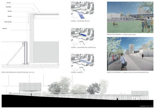 Notre PFE, nommé « Au fil de l’eau », illustre notre démarche initiale du projet. Tout d’abord Paris, grande métropole européenne traversée par son fleuve, la Seine fut notre point de départ. Celle-ci traverse, réunit mais aussi sépare pour se diviser en deux bras pour former son principal affluent : la Marne. C’est à cet endroit précis que se trouve la ville de Joinville-le-Pont qui se démarque autant par ses qualités paysagères rares et urbaines que par un territoire démonstrateur de son « savoir-faire ». La reconversion du site que nous proposons s’illustre comme un renouvellement mixte innovant s’appuyant sur les caractéristiques d’une ville productive afin de créer la ville de demain, de créer la métropole. Désenclaver le site ne signifiait pas seulement d’en rendre l’accès à tous mais de réellement l’habiter à travers des programmes mixtes ayant comme but de préserver et d’améliorer la qualité de l’environnement. Une nouvelle urbanité se crée sur le site en associant travail et habitat et en y implantant un équipement qui s’ouvre sur des espaces publics, afin d’offrir une toute autre dynamique à ce territoire.