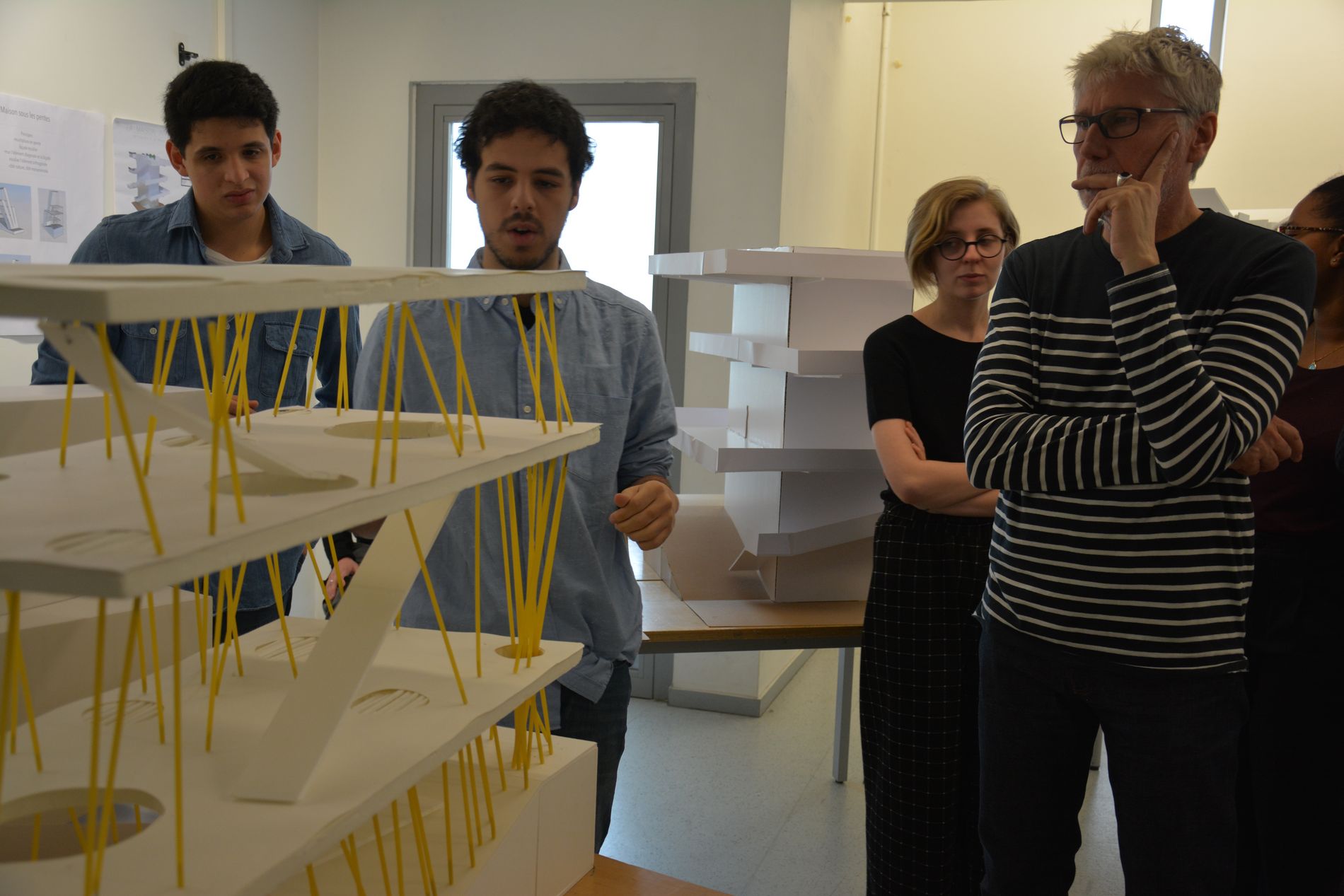 Chaque étudiant a d'abord testé plusieurs possibilités de structure en faisant des hypothèses à l'aide de maquettes au 1/100. Puis il a choisi une solution structurelle validée par Andréas Alexopoulos, enseignant ingénieur, pour passer au 1/50. La troisième séance a été marquée par le second changement d'échelle - du 1/50 au 1/20 - et toutes les modifications constructives qu'il implique.