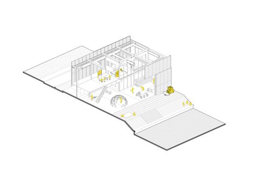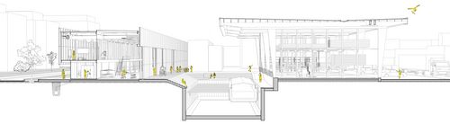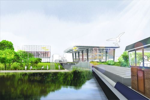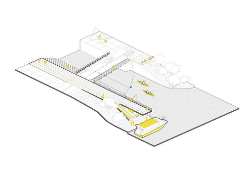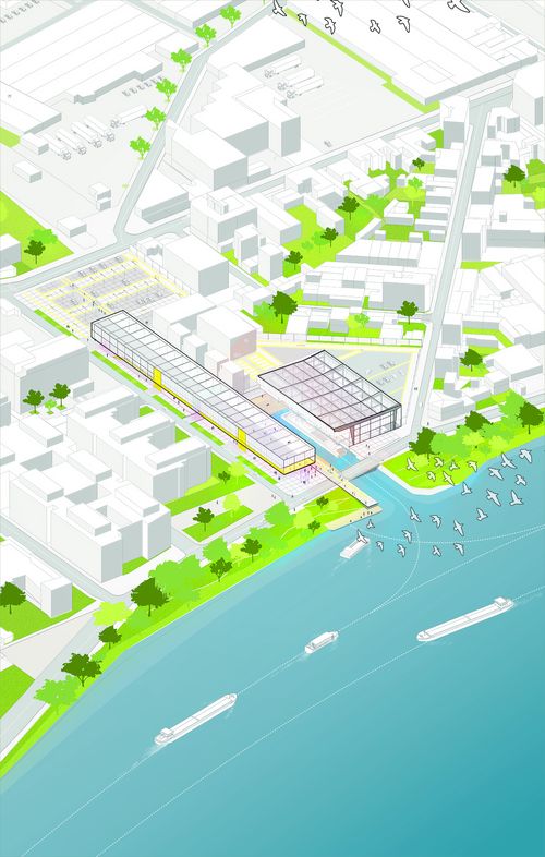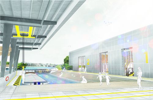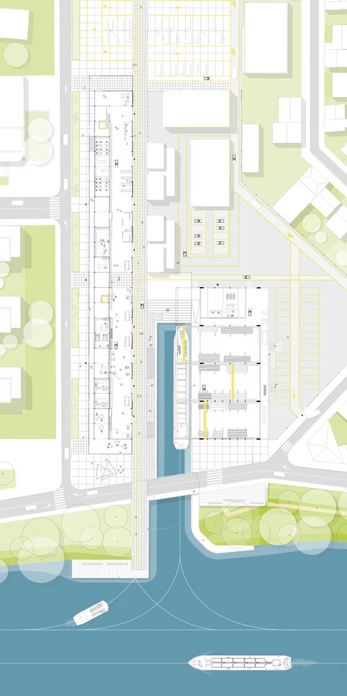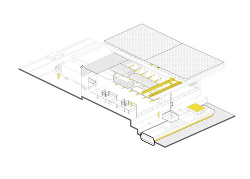 Il s’agit donc de conserver l’activité productive tout en créant une interface avec les riverains. La création d'une darse permet alors de capter le flux de la Seine et d’introduire le fret de marchandise dans la ville. Afin de garantir la sécurité des visiteurs, un réseau interne permet aux véhicules utilitaires d’accéder à la halle logistique et aux ateliers. Les venelles piétonnes tissent des liens vers les bâtiments en projet (Ateliers et halle de stockage) et donnent à voir depuis la “rue” les activités de production, stockage et fabrication.