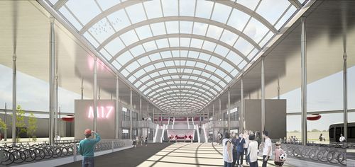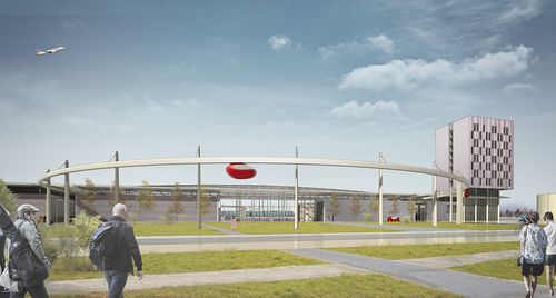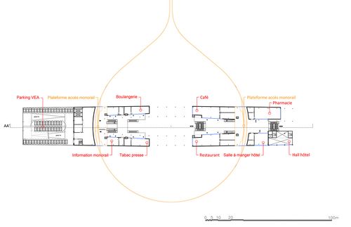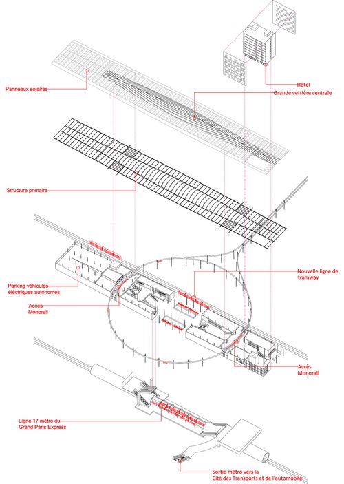 La station multimodale a une position centrale et dessert l’ensemble du site. Elle permet l’interconnexion de multiples modes de transports avec une pluralité de services essentiels pour la vie quotidienne. Elle constitue une interface nouvelle entre la Cité et une architecture habitée, et permet également de connecter le site avec son environnement.