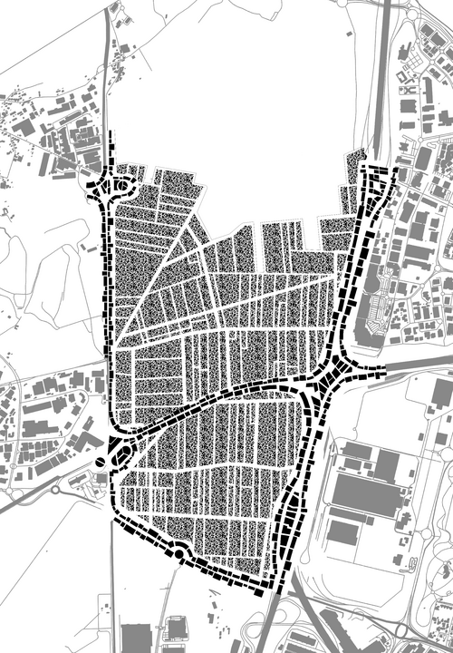 Si les champs sont recouverts d’un bâti de petite échelle, les bordures de la parcelle accueillent des constructions bien plus importantes, des équipements, vastes espaces commerciaux ou encore, des immeubles de bureaux. Ces bâtiments viennent s’implanter autour d’une nappe, espace de circulation douce, venant recouvrir l’ensembles des voiries existantes.