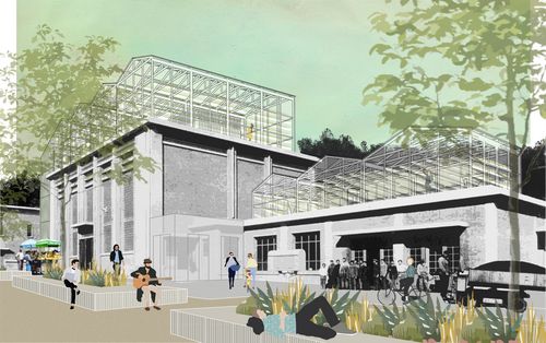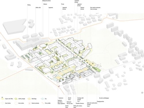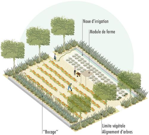 Il s'agit d'un projet d'articulation entre lieu de vie et d'agrément, partagé avec un espace de production agricole. Ce caractère agricole du site est complété par des serres sur les différents bâtiments qui ont une toiture terrasse. À l'intérieur de ces édifices particuliers, nous implantons des activités de transformation et de vente sur place qui sont les maillons d'un circuit court permettant d'alimenter ce nouveau lieu de vie.
