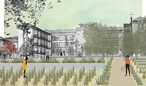 Nous proposons de réaliser une réhabilitation de l'ensemble du site en y impulsant notamment un réemploi des parties "vides" entre les bâtiments : les sols. En y intégrant des dispositifs d'agriculture, il est possible d'aménager un circuit court en matière d'alimentation, tout en renforçant le caractère paysager du site existant.