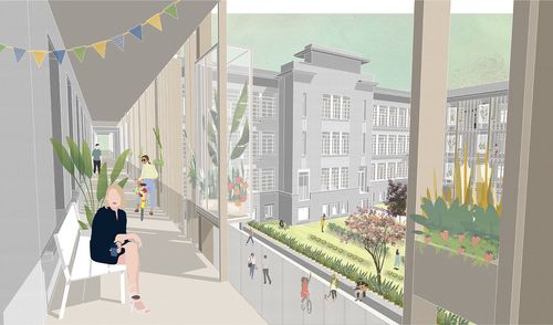 Nous intervenons architecturalement deux fois. Premièrement, l'ancienne chaufferie de l'hôpital intégrera un point de vente des denrées localement produites, des ateliers de transformation et une serre hydroponique sur son toit. Ensuite, nous transformons un des bâtiments hospitaliers en logements de types variés avec des jardins partagés et un dispositif de serres individuelles accessibles depuis la coursive qui distribue les lieux.