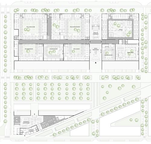 La recherche agronomique, longtemps restée en amont de la production alimentaire, cherche de nos jours, à informer le public sur les thématiques de l’Agriculture et l’Alimentation pour le sensibiliser à l’Environnement et aux pratiques écologiques. Nous avons voulu créer un lieu favorisant les interactions entre les acteurs des différents domaines scientifiques, mais aussi entre la recherche et le public. Notre programme est composé de cinq entités : un lieu de vie « le Forum », un établissement d’enseignement supérieur « AgroParisTech », un centre de recherche « l’INRA », une résidence étudiante et un espace extérieur public. Le concept architectural valorise l’échelle du piéton, et ouvre les portes de l’Agronomie au grand public.