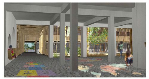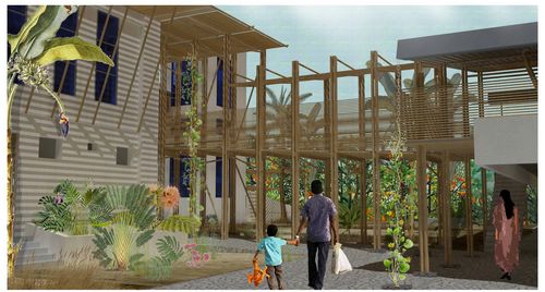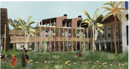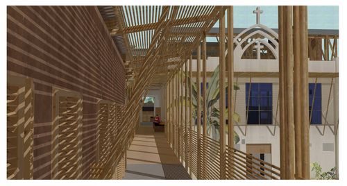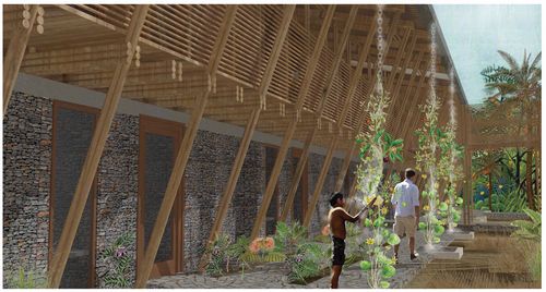 Face à l’inadaptabilité du bâtiment à son climat, une seconde peau est greffée au bâtiment existant. Faite à partir des eucalyptus issue de l’agroforesterie mise en place, celle-ci intègre des dispositifs de protection solaire type brise soleil, et vient s’épaissir pour y accueillir la nouvelle circulation liée aux programmes ainsi que des éléments techniques de ventilation naturelle, tels que des puits canadiens et des cheminées solaires. au Sud, le soleil a un rayonnement très vertical, une casquette en bois est donc ajoutée en partie supérieure des façades. A l’est, aussi bien en été qu’en hiver, le soleil tape sur la façade uniquement le temps de la matinée. De la végétation grimpante est ainsi associée à la structure de la double peau, faisant office de brise soleil. A l’ouest, l’ensoleillement est bien plus long et horizontal, la double peau est ainsi composée de brise soleil dense pour une protection optimale. offrir une protection à la toiture terrasse jusque la inexploitée, et devient une cour verticale et y abrite la bibliothèque. le nouveau bâtiment, l’internat, la stratégie climatique est différente. En effet, contrairement à l’existant où il était impossible de casser les dalles qui participaient au contreventement de la structure ,pour inclure les éléments de ventilation, est désormais possible de concevoir ce nouveau bâtiment en intégrant ces dispositifs. Ainsi, le rez-de-chaussée est en murs structurels de gabion (réutilisation des déchets de granites). Ces murs, épais d’un mètre, contiennent 3 vides techniques permettant le passage de gaines de puits canadien dans l’un, pour le rafraîchissement de l’air. A l’intérieur des deux autres cavités, l’air frais y est directement insufflé : le granite, par sa forte inertie, va rester frais au contact de cet air. Le mur prends alors le rôle de radiateur d’air frais. Le R+1 est fait de charpente d’eucalyptus et de torchi, fabriqué à base de terre excavée de la phyto-épuration et de la poudre de granite. L’ensemble des chambres est organisé autour de patios, qui jouent le rôle de poche d’air frais. direct sur les chambres et l’évacutation de l’air chaud . Enfin, les circulations viennent se dilater et se transforment en lieux de rencontre et d’échange, tournés vers le paysage.