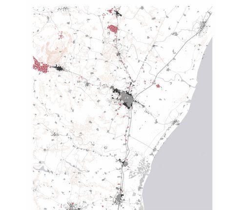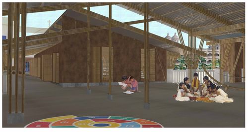 Dans un contexte principalement agricole, entre culture de tabac et eucalyptus, le site fait face au SSN College, un campus universitaire d’ingénierie de 3000 étudiants, replié sur lui même. Tout deux se trouvent le long d’un axe routier très passant, reliant la ville de Chimakurthis et d’Ongole. Une visite de site en décembre 2018 a permis de s’imprégner de la culture indienne qui était pour nous trois totalement inconnue, de découvrir et d’appréhender le bâtiment à réhabiliter, d’en faire le relevé, et de recenser les ressources matérielles et humaines, propices au développement du projet. A la suite de cette visite, plusieurs problématiques se sont soulevées. Tout d’abord, l’économie de l’Andhra Pradesh est basée sur l’exportation et l’industrie du granite, qui génère chaque jours des quantités astronomiques de déchets ( chutes de plaques, gravats, poudre de granites) qui sont déversés le long des routes et dans les friches. Autre point, l’agriculture est l’une des principale source d’économie du pays et façonne la majorité des zones rurales. Face à un site situé dans un entre-deux villes à la croissance non-maîtrisée et entouré de monoculture d’eucalyptus, dont une partie appartient à l’association mandataire, ces cultures se présentent comme une source de matériau potentielle pour le projet, mais également comme un éventuel poumon vert à préserver de la future urbanisation, générateur d’un maillage urbain/agricole compatible. est une ressource rare, et le non-accès à l’eau potable génére lui aussi des déchets plastique, jetés sur les bas côtés . Et enfin, face à une uniformisation des systèmes constructifs en béton, de type poteaux-dalles, qui s’affranchit des traditions et du contexte climatique, le bâtiment est très clairement inadaptés à son climat, soumis à une sur-exposition et donc, au rayonnement direct du soleil. Pour répondre à ces différents enjeux et constats, il est d’abord proposer de tramer la parcelle avec un système de phyto-epuration, reconnectant ainsi le bâtiment a son contexte (lisières, cultures et campus) et permettant le recyclage des eaux grises et leur réutilisation . Cette trame est couplée avec système de récupération des eaux de pluie, qui, associé à un filtre carbone, rend l’eau potable. Les chutes de plaques et poudre de granite sont ici utilisés pour le parement au sol et la membrane imperméable de la phyto-épuration. Les monocultures sont transformées en parc agroforestier, visant à encourager l’autonomie nourricière de la parcelle, en intégrant des cultures maraîchères et vivrières entre les eucalyptus. Cela permettra également de réguler les ressources des sols pompées par les monocultures. Les eucalyptus retirés, sont réintégrer dans le projet et consitutent le matériaux de base des charpentes.