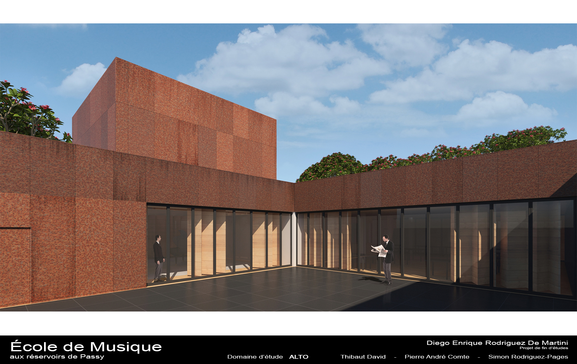 L’objectif principal était de créer un espace pour réactiver la zone, étant donné que le 16ème arrondissement est un quartier assez calme, nous sommes arrivés à la conclusion que la meilleure option serait un équipement public, culturel et éducatif : une école de musique. L'idée est de traiter le volume de la réserve d'eau comme une pièce solide qui va être perforée, créant des patios qui éclaireront naturellement l'intérieur du bâtiment.