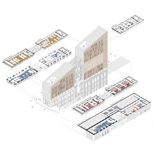 Le programme proposé se compose de logements, commerces, espaces de travail, un centre de formation, un fab-lab et un datacenter. Les différents éléments du programme fonctionnent ensemble, afin d'obtenir un bâtiment éco-responsable, inscrit dans l'économie circulaire et la valorisation des ressources énergétiques dites propres, en plus d'encourager les interactions humaines, étant au cœur conceptuel du projet.