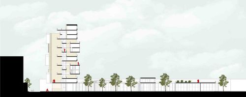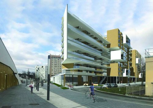 La résidence étudiante se développe au dessus du Learning Center. Elle est constituée de coursives extérieures qui desservent les chambres (4 typologies différentes) ainsi que des espaces collectifs (loges) qui se détachent et ressortent en façade et de vastes terrasses.