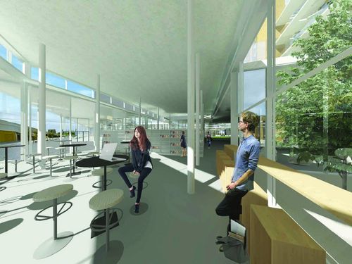 Le Learning Center se déploie sur le site comme une plaque perforée de patios avec différents types d’espaces de travail et de détente. Il a été conçu comme un paysage urbain, son toit est accessible et planté lui faisant prendre ainsi le rôle de jardin public.