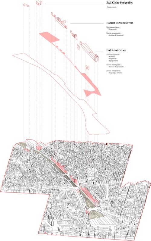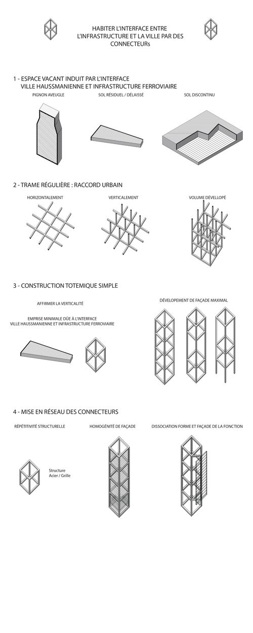 Notre projet urbain consiste en la création d’une continuité passante le long du faisceau ferré de la gare Saint Lazare. Il s’exprime par des interventions ponctuelles le long de son système en fonction des opportunités foncières et morphologique permises par le tissu urbain à savoir les parcelles résiduelles et les pignons aveugles. Les éléments fonctionnent en réseau en créant une continuité urbaine. On peut considérer nos interventions comme minimalistes par leur échelle propre et infrastructurelles par leur fonction de connexion urbaine.