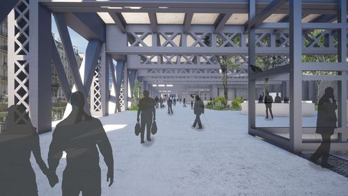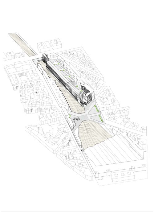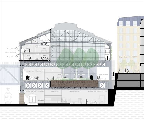 De plus, nous avons questionné et requalifié la place des industries ferroviaires souvent délaissées ou sous-exploitées. Ces grandes emprises foncières en milieu urbain sont devenues des enjeux de renouvellement urbain. Le projet architectural proposé porte sur la réhabilitation et la reconversion des anciennes halles des messageries de la gare Saint-Lazare, actuels « parking du pont de l’Europe» et centre de tri de la Poste. Ces vastes bâtiments surplombants l’écheveau des voies ferrées offrent des espaces généreux au cœur de Paris. Pourtant dotées d’un fort potentiel architectural et urbain, ces halles semblent inexistantes dans la vie urbaine parisienne. Cette inadéquation entre forme architectural, programme et position urbaine est questionnée par ce projet.