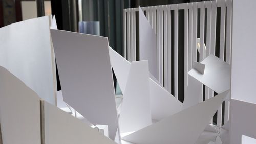 Le temps d’un semestre, dans le cadre d’un enseignement de licence, autour de la question des processus de création et d’une réflexion sur les questions d’architecture que pose la scénographie d’exposition, un groupe d’étudiants et leur enseignant André Avril, se sont penchés sur le propos de l’exposition Architectures Intérieures, exposition qui allait être présentée quelque mois plus tard au sein de leur école.