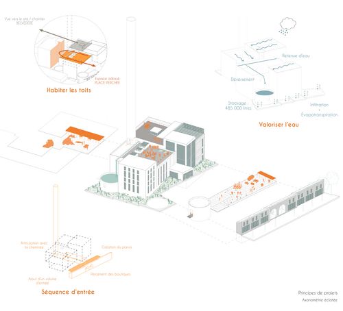 Points d’accroches des interventions spatiales, les éléments remarquables composant l’îlot technique sont mis en valeur et réutilisés dans le projet.