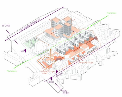 Le travail présenté a pour contexte l’horizon 2030, une fois l’hôpital délocalisé et s’empare, en plus de la chaufferie, de la centrale énergie et du bâtiment des boutiques sur l’Avenue de la Porte de St Ouen. Le projet raconte l’appropriation progressive de ces bâtiments comme première «colonisation» du site par la ville pendant le temps du chantier. Il se focalise sur la reconversion des deux bâtiments logistiques en équipements publics.