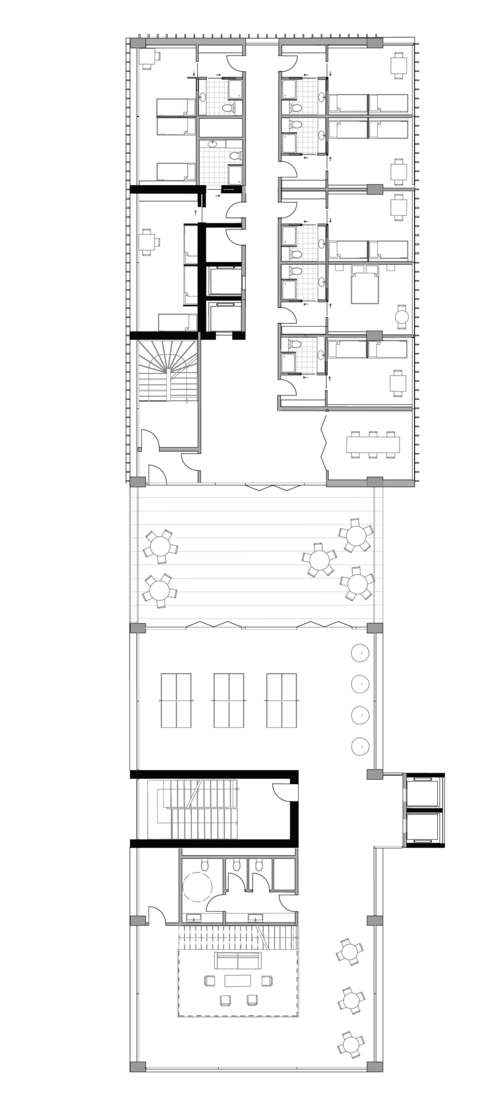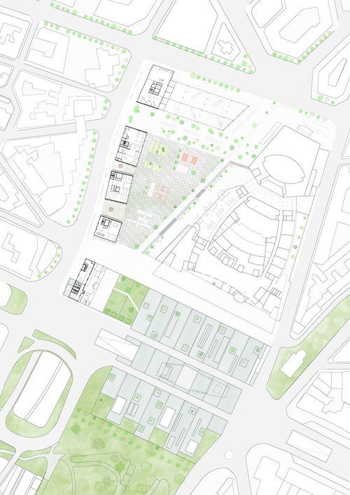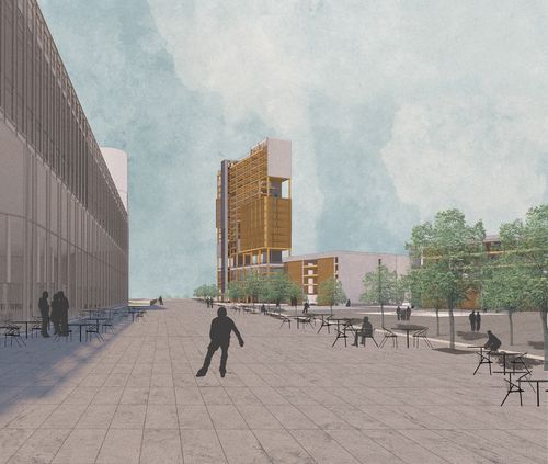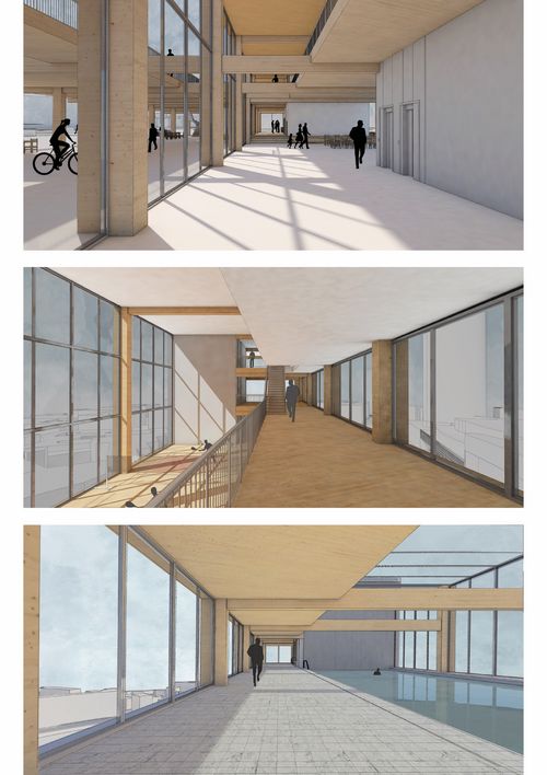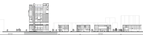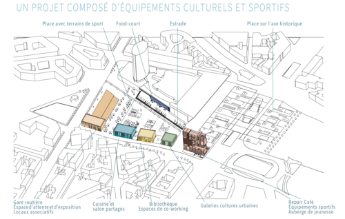 Au-delà des connexions facilitées par les espaces extérieurs créés, des bâtiments-mêmes sont traversés (passage à travers le Palais des Congrès, promenade verticale dans la tour) et dialoguent ainsi avec l'espace public qu'ils prolongent.