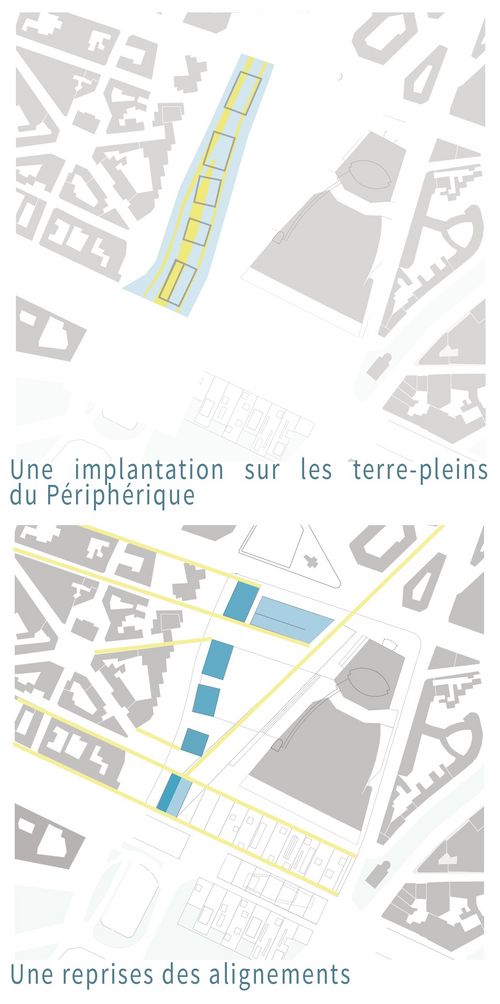La thématique initiale de ce projet était le franchissement du Périphérique, mais suite à l'analyse urbaine nous avons finalement proposé des "franchissements" dans tous les sens : les traversées de part-et-d'autre de l'axe historique et du Boulevard des maréchaux ont également été traitées.