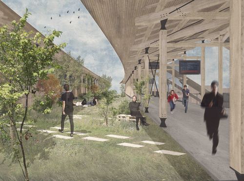 Ce coeur vert qui structure le projet est perceptible en tout point de la gare et est également le support d'une réflexion bioclimatique. Nous avons eu d'une part la volonté d'avoir une traversée de la biodiversité, pas seulement visuelle mais également écosystémique. La végétation y est intensive pour être un lieu de nutrition et de vie pour insectes et oiseaux