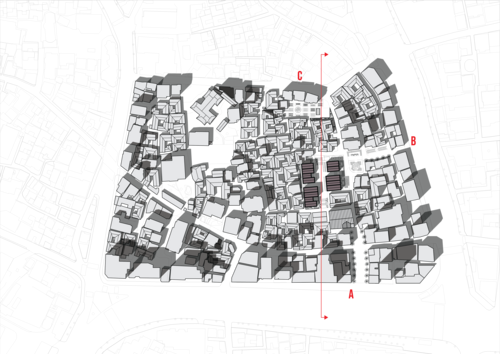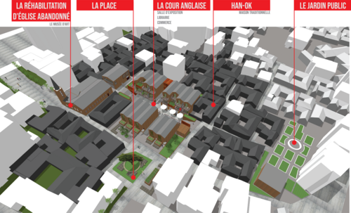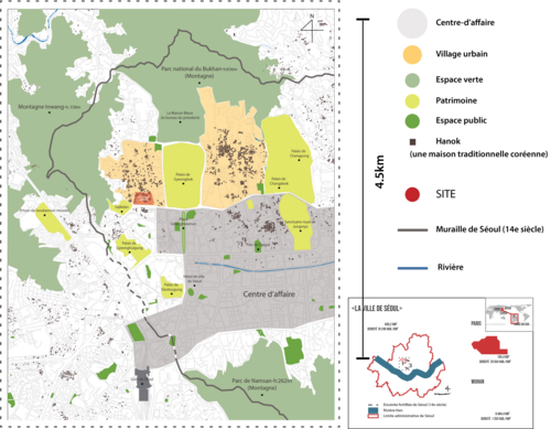Il faudra d'abord vous expliquer le contexte de la naissance de la typologie des Hanoks- urbains : il faut différencier les Hanoks et les H urbains : les H sont des maisons traditionnelles caractérisées par l'occupation d'une grande parcelle. Hanoks urbains sont nés au début du XXe siècle, pendant la période de la croissance urbaine de Séoul. Ils sont issus du découpage de la grande parcelle du H existant en plusieurs parcelles tout en créant les ruelles (venelles) entre elles. Les Hanoks urbains constituent toujours une grande identité de la ville de Séoul, particulière dans des quartiers possédant beaucoup de ruelles. Ainsi, les ruelles et cette typologie de H urbain sont étroitement liés. J'ai envie de redonner la dimension urbaine aux ruelles : pour créer la centralité, j'ai créé volontairement des espaces publics sur des endroits stratégies en assurant leur continuité grâce aux ruelles. Donc le quartier devient traversant grâce à sa porosité et attire le flux vers l'intérieur grâce à sa centralité. Donc ma stratégie urbaine se trouve sur le croisement de ces deux propriétés : la centralité et la porosité.